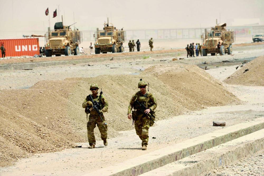 جنود أمريكيون يمشطون منطقة تم فيها تفجير انتحاري من طالبان بسيارة مفخخة مستهدفا قافلة للقوات الأجنبية (حلف الناتو) في ولاية قندهار جنوبي أفغانستان. (أ ف ب)