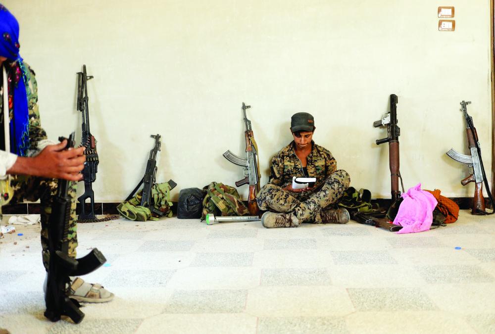 مقاتل في قوات سورية الديموقراطية في الرقة أمس الأول. (رويترز)