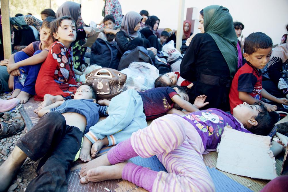أطفال عراقيون مع أمهاتهم فارون من الموصل ينامون في نقطة تجمع للنازحين غرب المدينة. (أ ف ب)