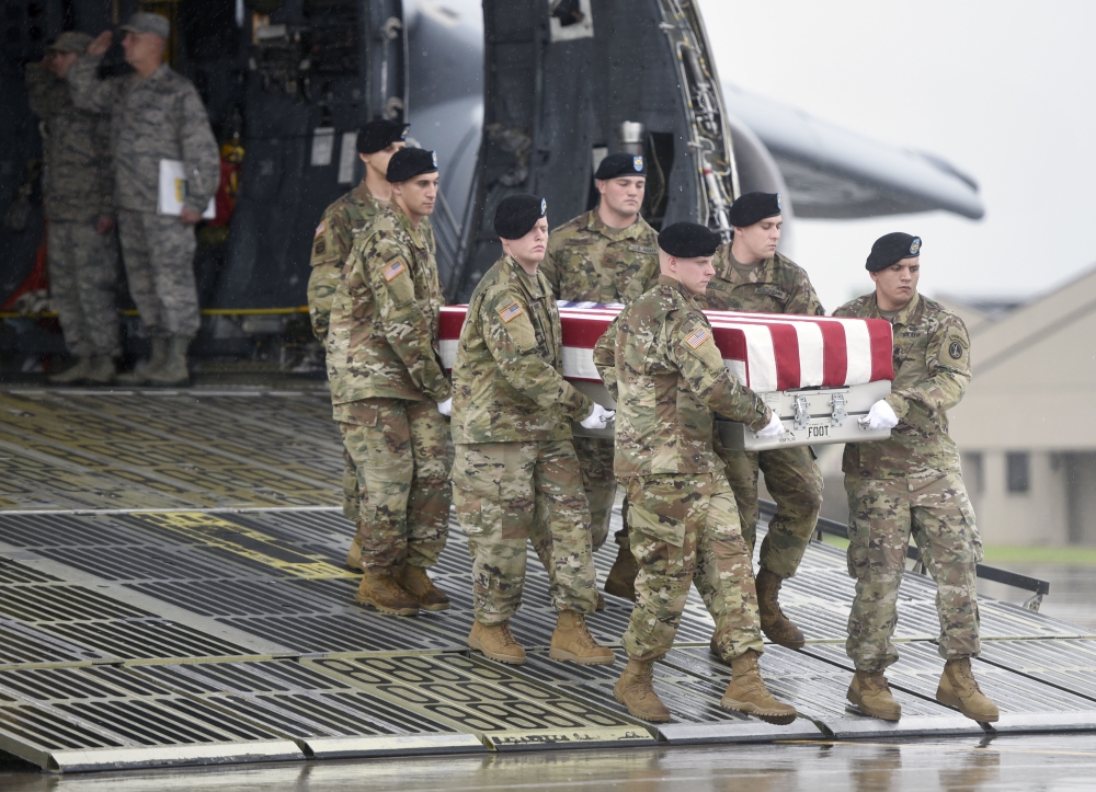 جنود أمريكيون في العراق ينقلون جثمان زميلاً لهم قتل خلال العمليات مع "داعش" . (أ ف ب)