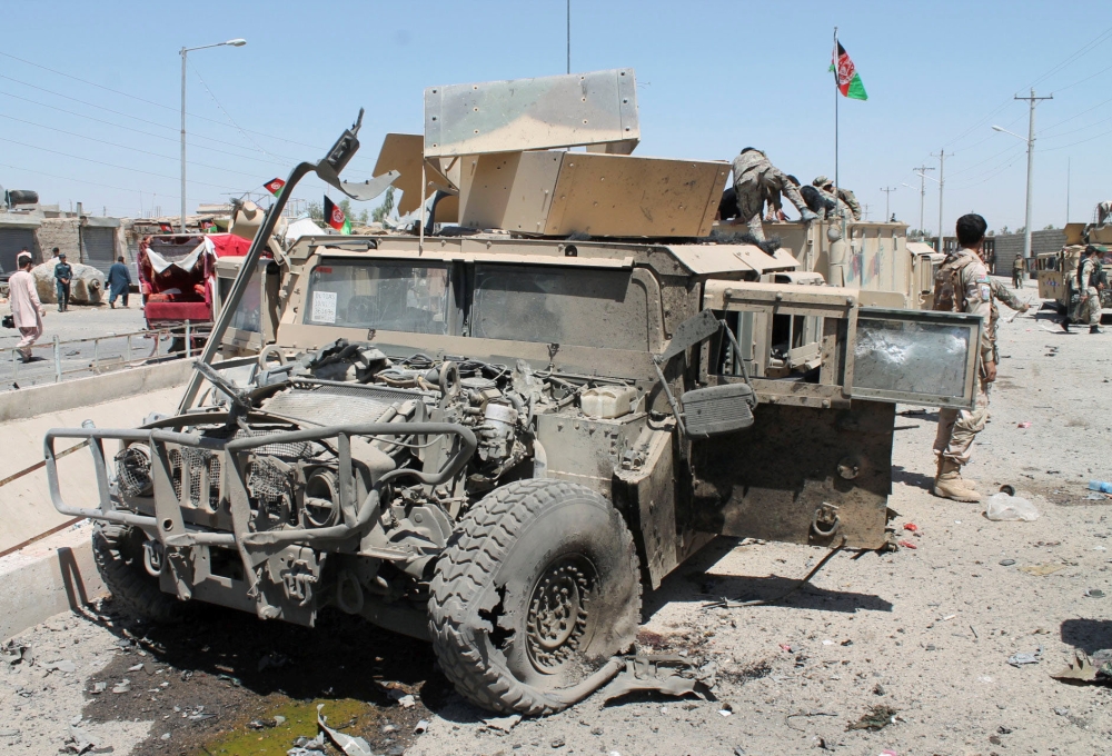 Afghan National Army (ANA) soldiers inspect damaged army vehicles after a suicide attack in Lashkar Gah, Helmand province, Afghanistan August 23, 2017. REUTERS/Stringer NO RESALES. NO ARCHIVES