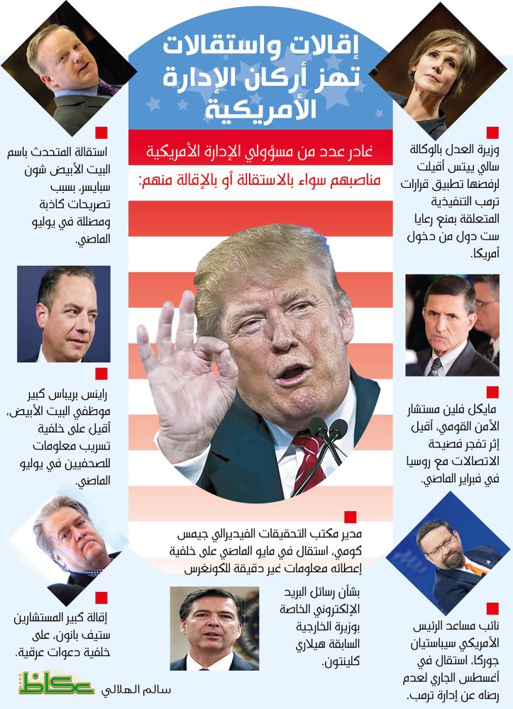 وسبق أن غادر عدد من مسؤولي الإدارة الأمريكية مناصبهم سواء بالاستقالة أو بالإقالة منهم: ستيف بانون كبير مستشاري ترمب، ومايك فلين مستشار الأمن القومي، وراينس بريباس كبير موظفي البيت الأبيض، وبريان كرزانيتش وكينيث فريزر المستشاران في «لجنة المصنعين الأمريكيين».