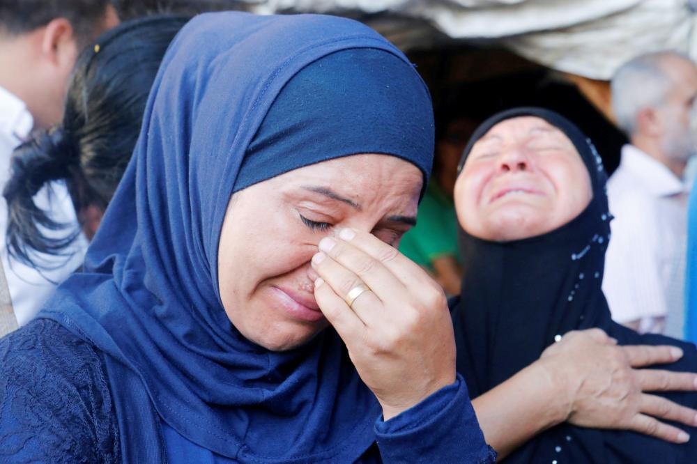 أقارب العسكريين اللبنانيين المختطفين لدى داعش ينتحبون عقب سماع العثور على رفاتهم أمس في بيروت.(رويترز)