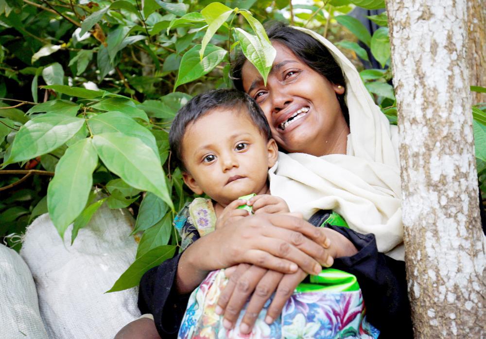 امرأة من روهينجا ميانمار تبكي برفقة طفلها، بعد منعها دخول بنغلاديش أمس. (رويترز)