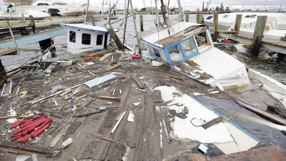 قوارب دمرها إعصار هارفي في روكبورت بولاية تكساس أمس الأول. (أف ب)