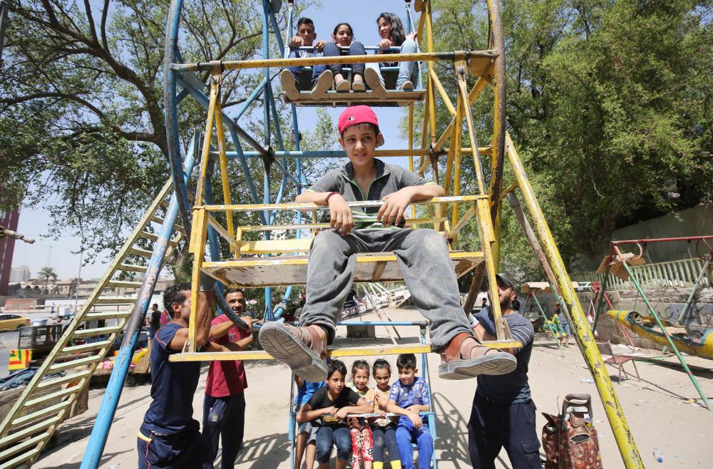 Iraqi children play in an amusement park on the second day of Eid al-Adha, or the Festival of Sacrifice, in a park in central Baghdad on September 2, 2017. Muslims around the world are preparing to celebrate the Eid al-Adha feast, set for 01 September 2017, when they will slaughter cattle, goats and sheep in commemoration of the Prophet Abraham's readiness to sacrifice his son to show obedience to God. / AFP / Ahmad al-Rubaye