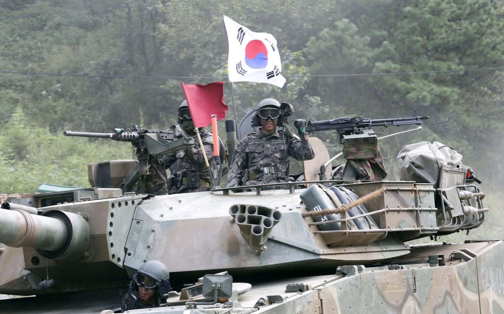 جنود كوريون جنوبيون على متن دبابة خلال تدريبات عسكرية قرب الحدود مع كوريا الشمالية أمس. (أ. ب)
