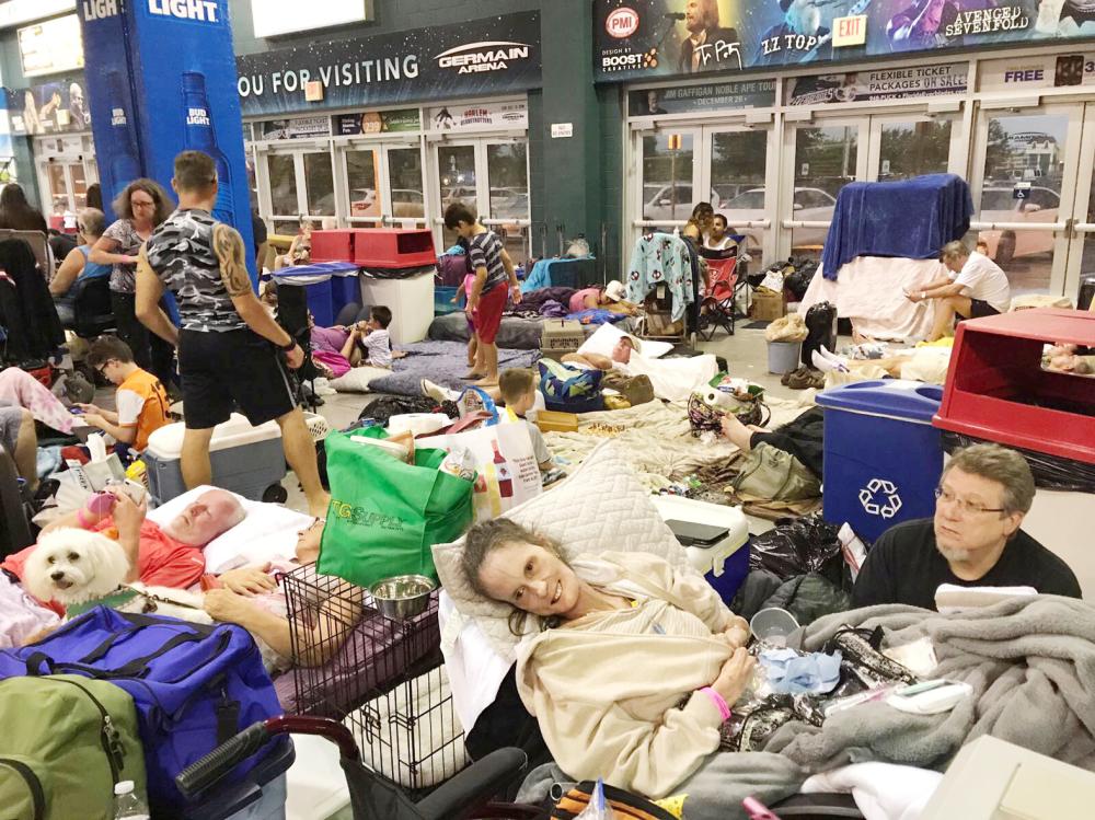 نازحون بسبب الإعصار يحصلون على مأوى داخل مدرسة في تامبا بولاية فلوريدا أمس الأول. (أ ف ب)