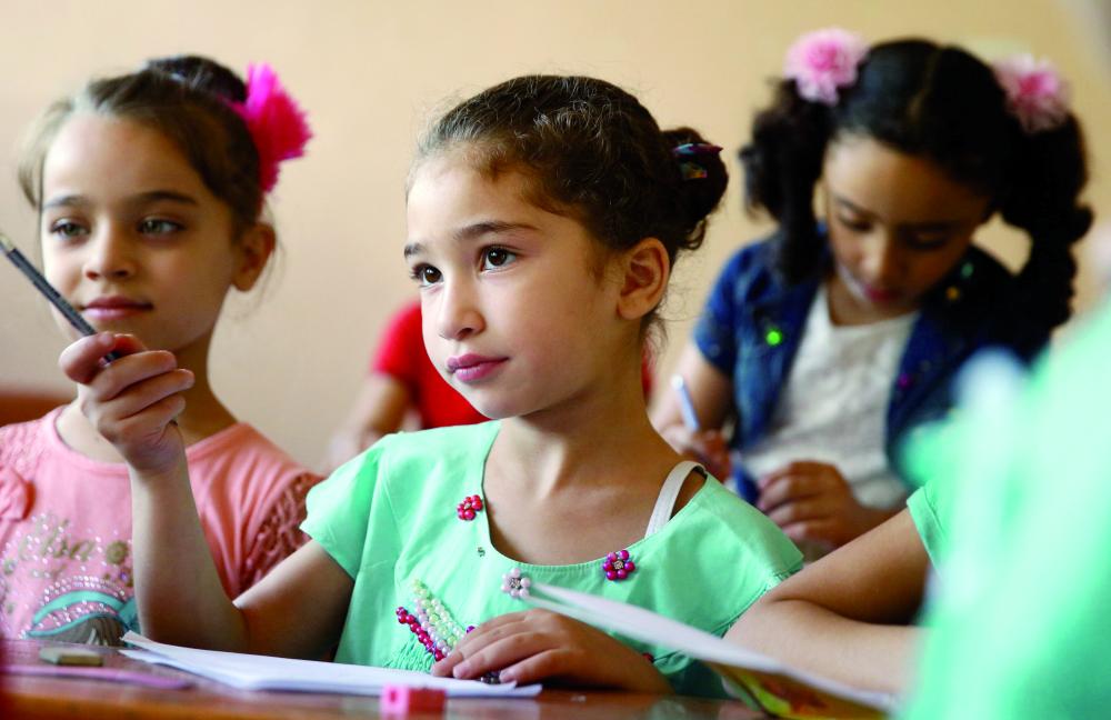تلميذة سورية تشير لمعلمتها أثناء حصة دراسية في دوما أمس. (رويترز)