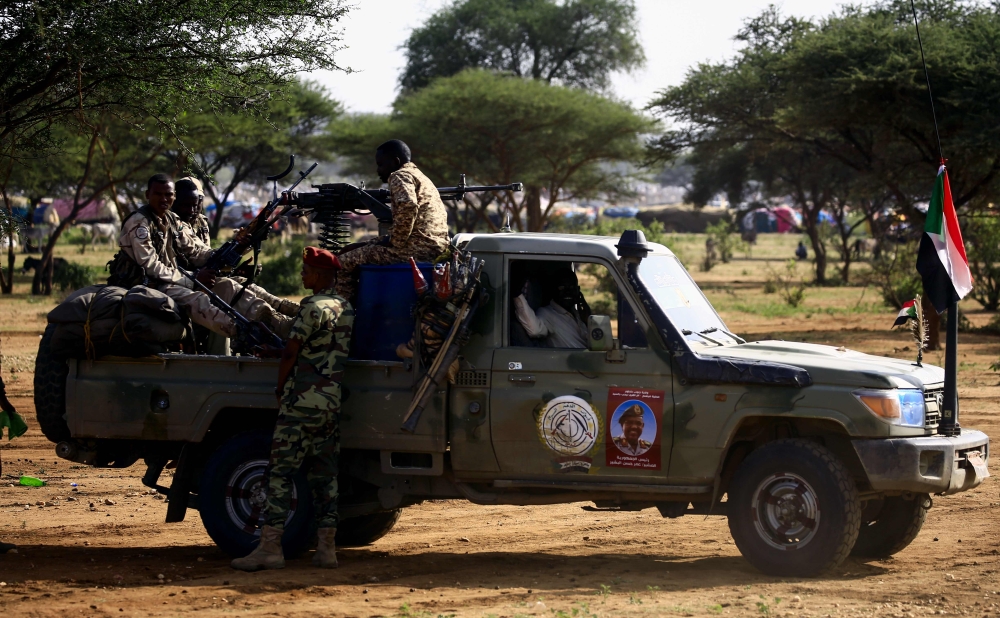Sudanese members of the Rapid Support Forces, a paramilitary force backed by the Sudanese government to fight rebels and guard the Sudan-Libya border, ride in the back of a Toyota pickup truck as they prepare to receive President Omar al-Bashir during his visit to the village of Umm al-Qura, northwest of Nyala in South Darfur province, on September 23, 2017. Bashir, wanted by the International Criminal Court on charges of genocide and war crimes related to the conflict in Darfur, is touring the region ahead of a US decision to be made on October 12, 2017 on whether to permanently lift a decades-old trade embargo on Sudan. / AFP / ASHRAF SHAZLY