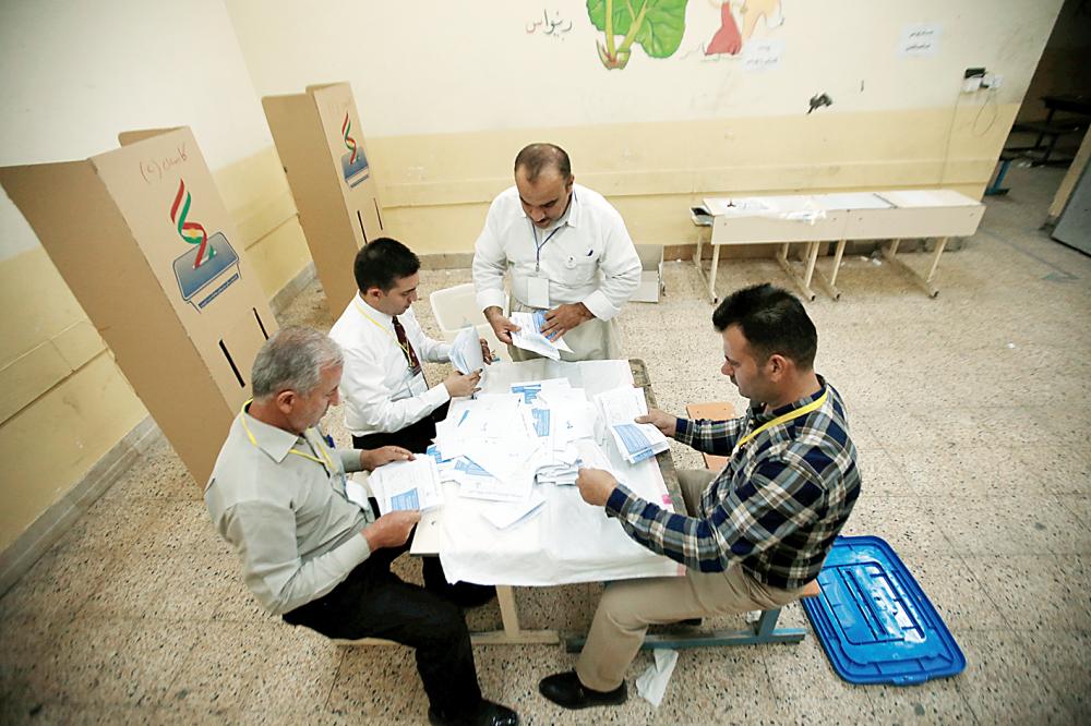 مسؤولون يفرزون أوراق الاقتراع في أربيل ، استعداد لإعلان النتائج النهائية لاستقلال كردستان . (رويترز )