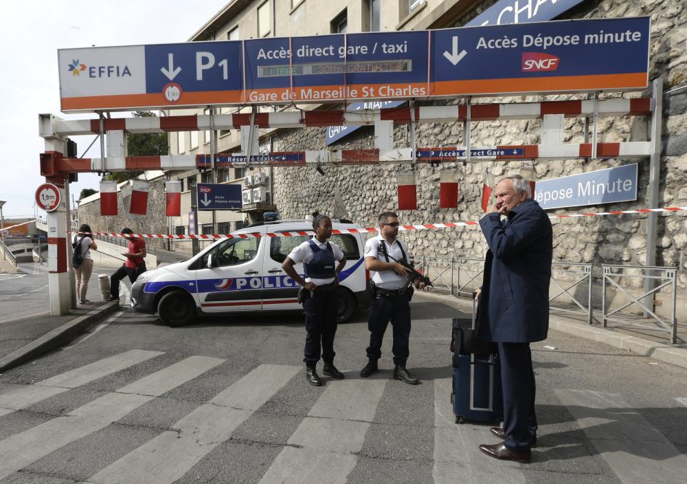 French police officers patrol outside the Marseille railway station, Sunday, Oct. 1, 2017. French police warn people to avoid Marseille's main train station amid reports of knife attack, assailant shot dead. (AP Photo/Claude Paris)