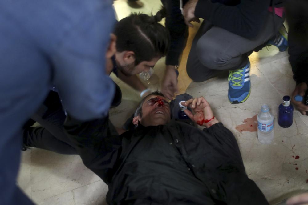 A protester is attended after being hit by a rubber bullet shot by Spanish National Police near the Ramon Llull school assigned to be a polling station by the Catalan government in Barcelona, Spain, early Sunday, 1 Oct. 2017. The Spanish government and its security forces are trying to prevent voting in the independence referendum, which is backed by Catalan regional authorities. Spanish officials had said force wouldn't be used, but that voting wouldn't be allowed. (AP Photo/Manu Brabo)