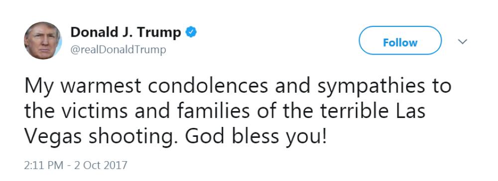 وقال ترمب في تغريدة على تويتر "تعازي الحارة وتعاطفي مع الضحايا وأسرهم في إطلاق النار المروع في لاس فيغاس".