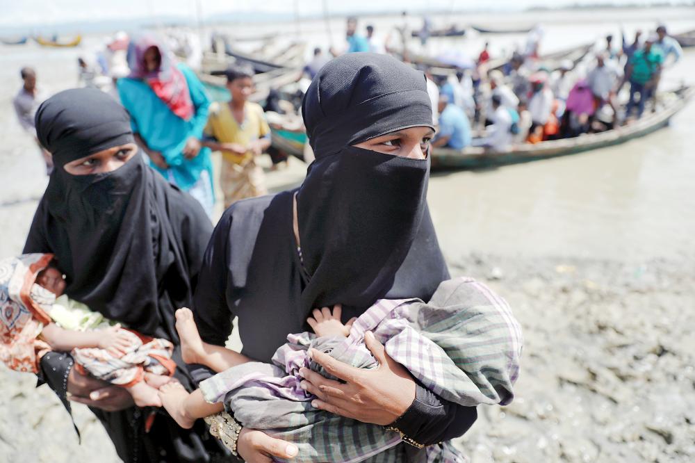 روهنغيتان فارتان من بورما تحملان طفليهما في طريقهما لمركز إغاثة قرب مخيم اللاجئين في بنغلاديش أمس. (رويترز)