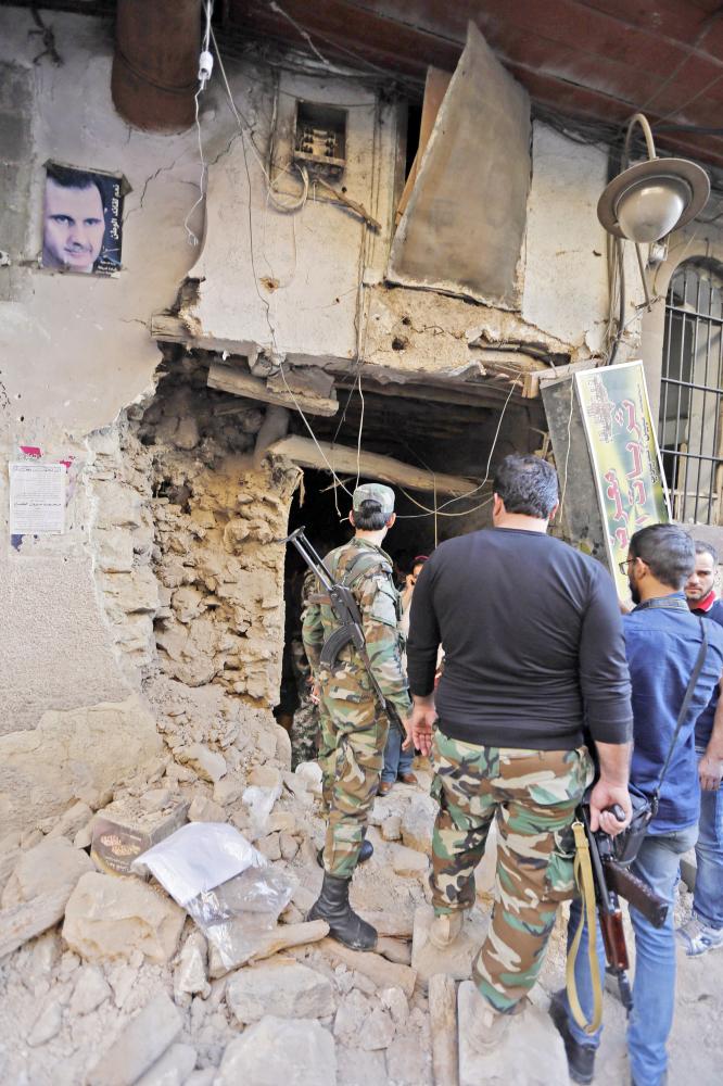 قوات أمنية سورية تتجمع في موقع التفجير في دمشق أمس. (أ.ف.ب)