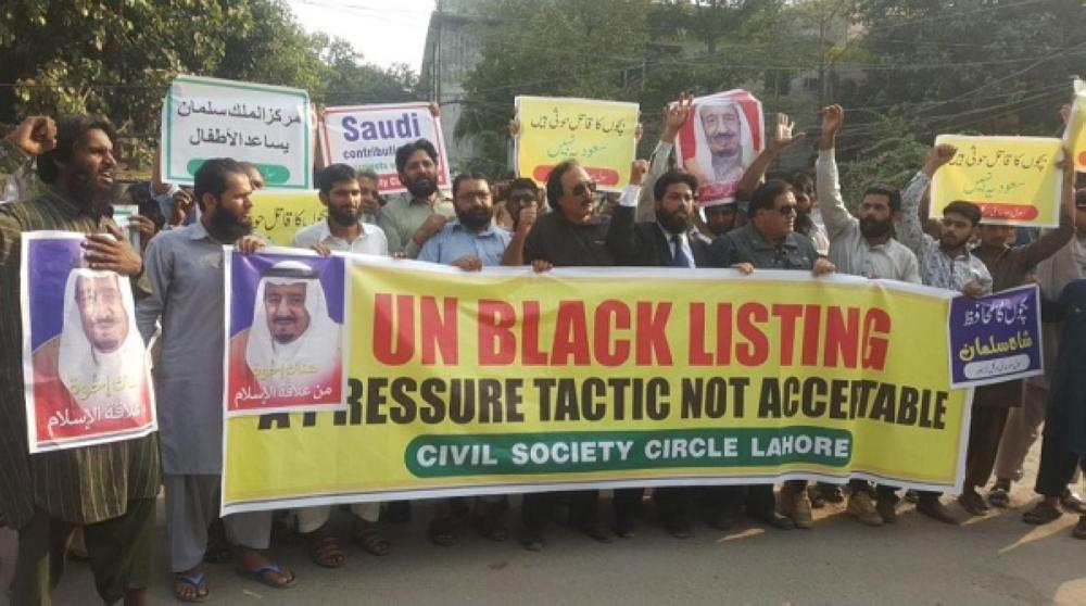شهدت مدينة لاهور عاصمة إقليم البنجاب الباكستاني، اليوم، وقفة احتجاجية حاشدة بقيادة منظمات المجتمع المدني للتنديد بتقرير منظمة الأمم المتحدة الذي حمّلت فيه التحالف العربي لاستعادة الشرعية في اليمن بقيادة المملكة العربية السعودية مسؤولية مقتل وإصابة (683) طفلاً باليمن.