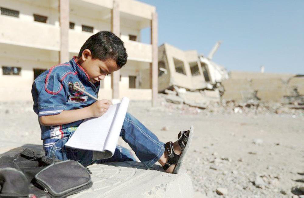 طفل يستذكر دورسه على أنقاض مدرسة دمرها الانقلابيون في تعز. (متداولة)