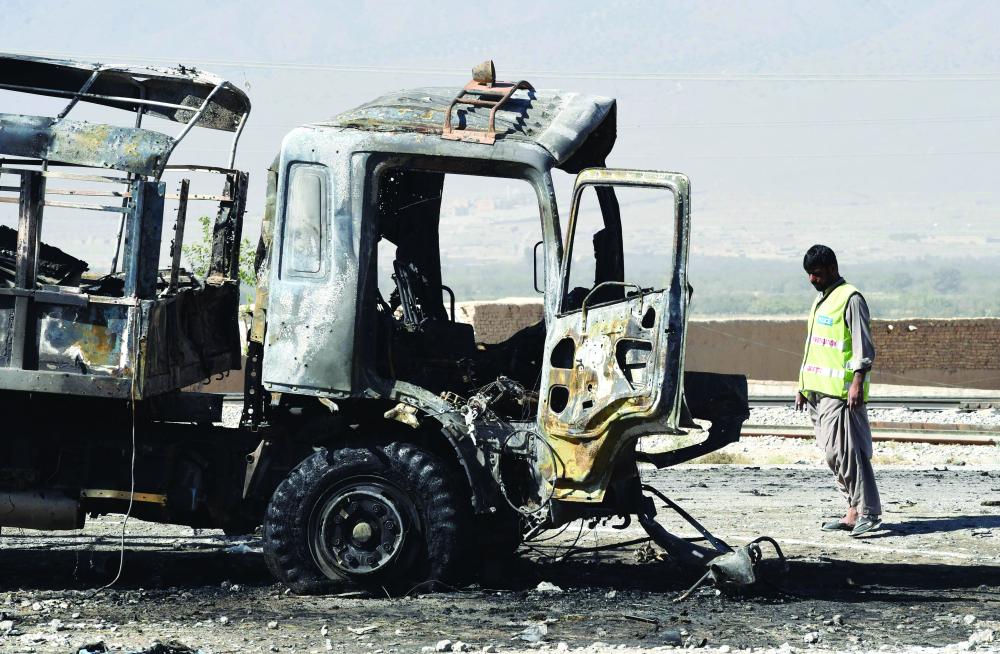 حطام شاحنة للشرطة الباكستانية عقب استهدافها بتفجير انتحاري في كويتا أمس. (أ.ف.ب)