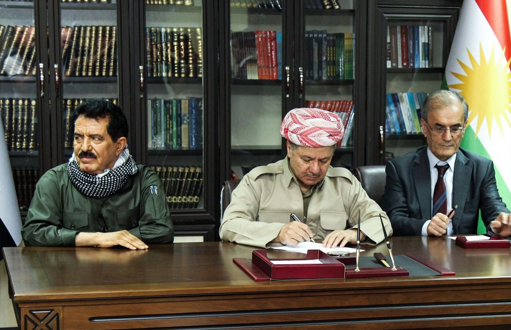 A file picture taken on September 12, 2017 shows Iraq's Kurdistan region president Massud Barzani (C) attending a meeting with Kirkuk provincial Governor Najim al-Din Karim (R), first Deputy for the Secretary General of the Patriotic Union of Kurdistan (PUK) party Kosrat Rasoul Ali (L), Peshmerga commander Jaafar Sheikh Mustafa (R), and other Peshmerga and Kurdish party leaders in the northern Iraqi city of Kirkuk. A Baghdad court on October 19, 2017, issued an arrest warrant for the vice president of Iraqi Kurdistan on charges of "provocation" against Iraq's armed forces, the judiciary said. / AFP / MARWAN IBRAHIM