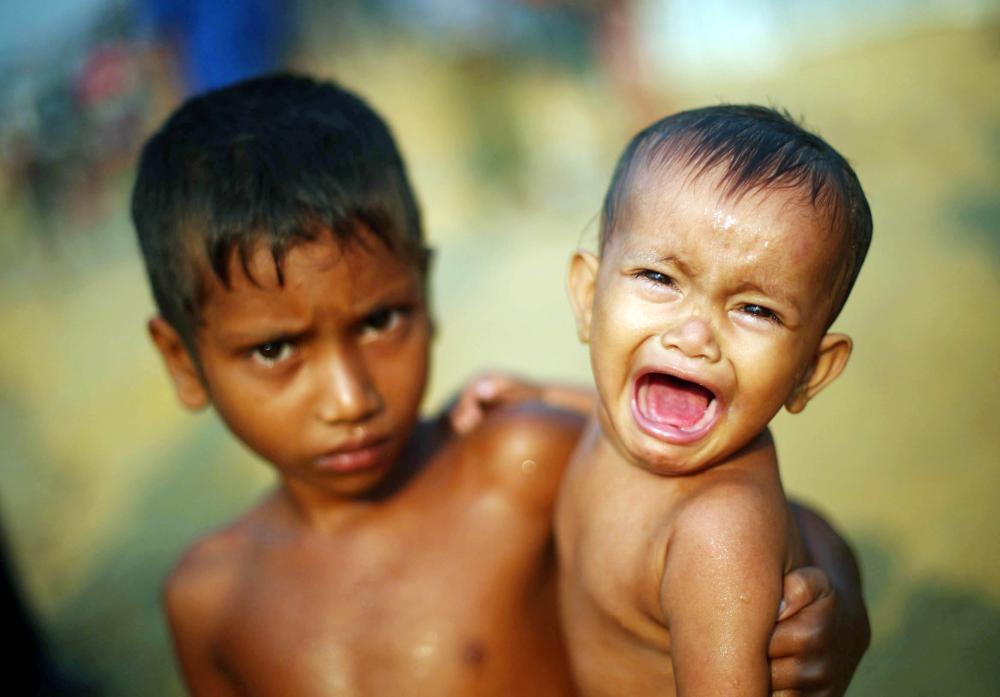 طفل روهينغي يبكي أمام مخيم للاجئين في بنغلاديش أمس. (رويترز)