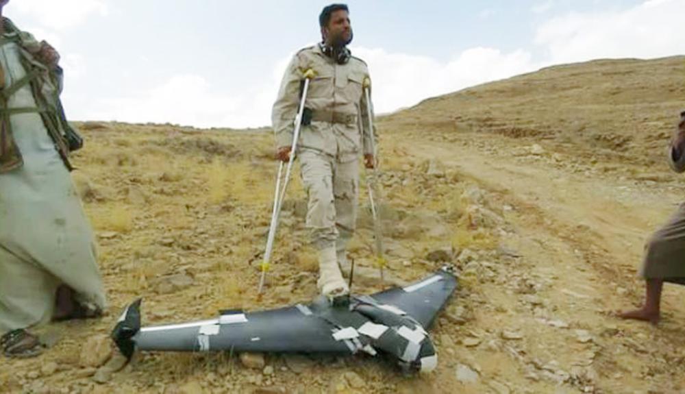 جندي يمني مصاب يضع قدمه على طائرة «درون» إيرانية أسقطها زملاؤه في صنعاء أخيرا. (متداولة)