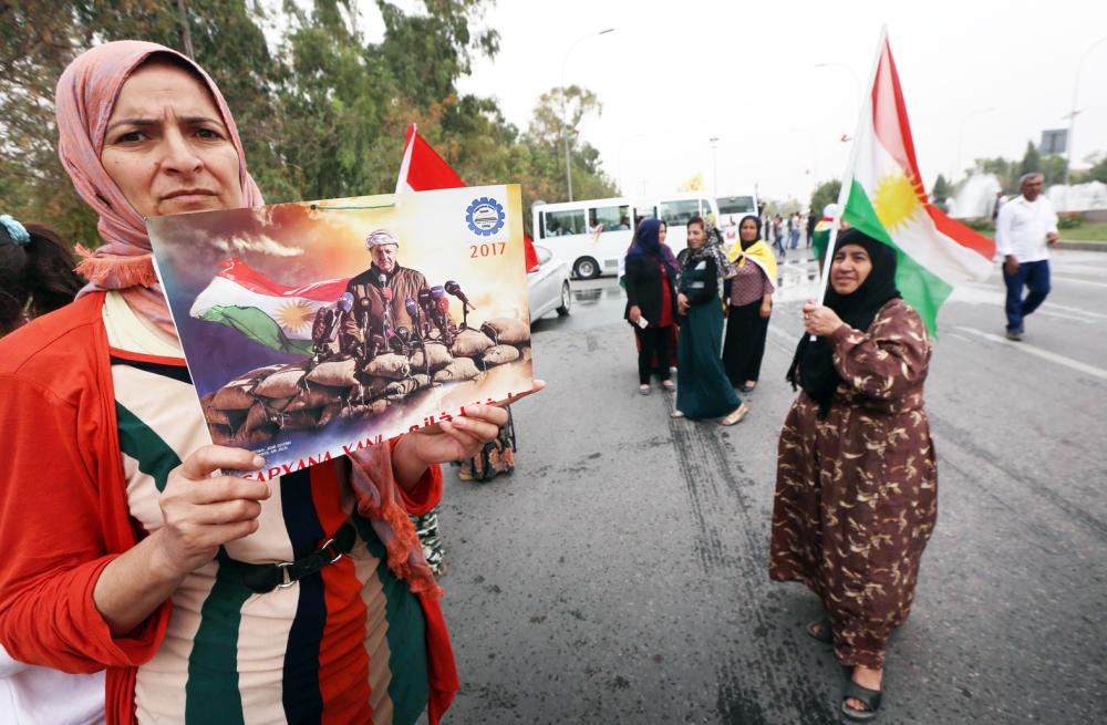 كردية تحمل ملصقا لبارزاني في أربيل أمس الأول. (أ. ف. ب)