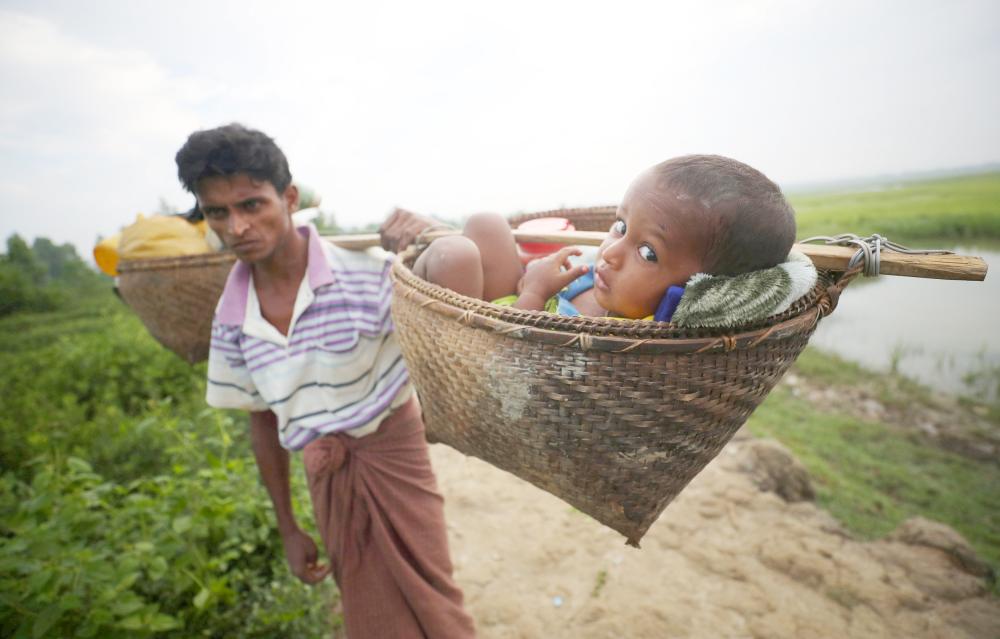 روهينغي يحمل طفله بعد عبورهما إلى بنغلاديش هربا من التطهير العرقي البورمي أمس. (رويترز)