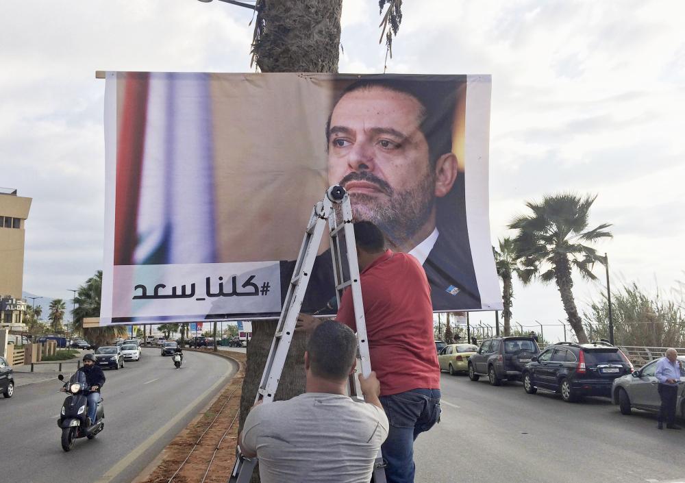 عمال لبنانيون يعلقون ملصقا كبيرا يحمل صورة الحريري وعبارة «كلنا سعد» في أحد شوارع بيروت أمس. (أب)