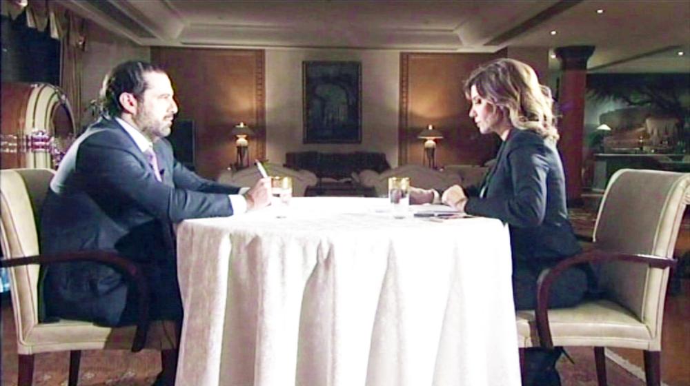 الحريري متحدثا إلى مذيعة تلفزيون المستقبل بولا يعقوبيان في الرياض أمس الأول. (أ ب)