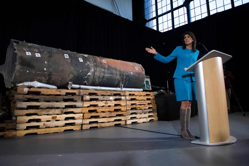 كشفت مندوبة الولايات المتحدة في مجلس الأمن نيكي هيلي أن أجزاء من الصاروخ الذي أطلقه الحوثيون على السعودية تؤكد أنه صنع في إيران، مؤكدة ثبوت أدلة على تورط إيران في استهداف السعودية بصواريخ الحوثي، وأن الحوثيون استهدفوا مطارا مدنيا في الرياض لإسقاط ضحايا بين المدنيين.