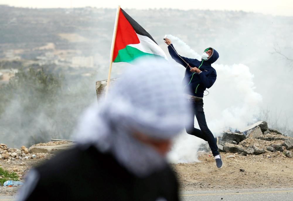 متظاهر فلسطيني يلقي عبوة غاز مسيل للدموع باتجاه قوات الاحتلال الإسرائيلي خلال اشتباكات على أطراف القدس أمس. (أ. ف. ب)