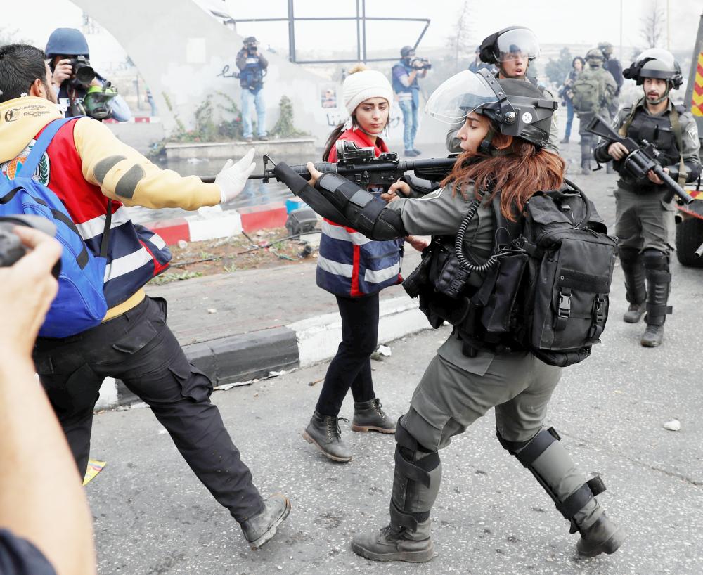 مجندة إسرائيلية توجه بندقيتها إلى صحفيين خلال تغطيتهم اعتقال ناشطين فلسطينيين شمال رام الله أمس. (أ ف ب)