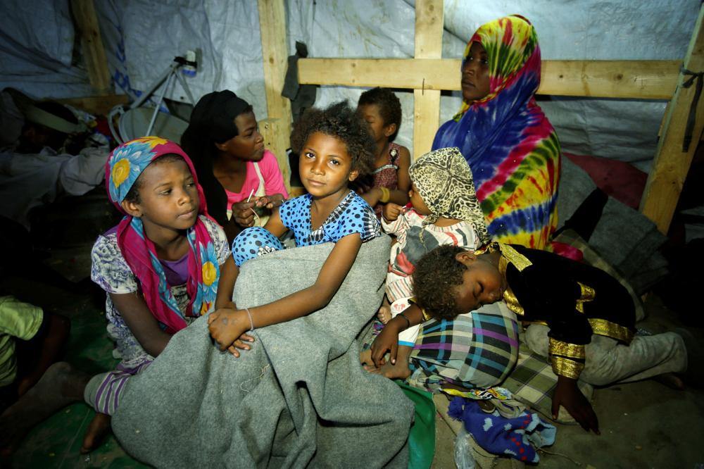 عائلة يمنية نازحة في مدينة الحديدة الساحلية أمس الأول. (رويترز)