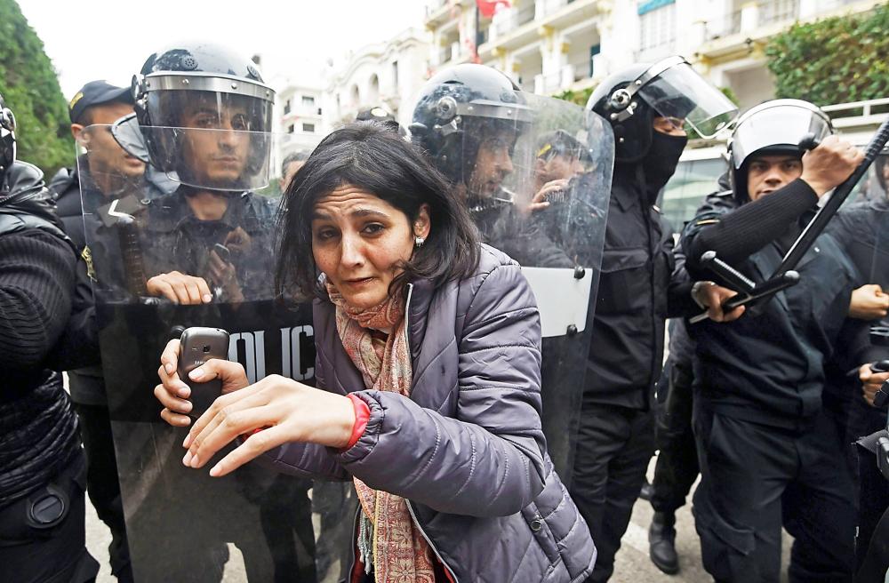 تونسية في حالة هلع من الشرطة خلال مظاهرة ضد الغلاء في العاصمة أمس. (أ ف ب)