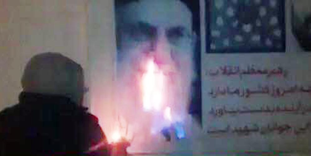 محتجون يحرقون صورة لعلي خامنئي في مشهد ليلة الجمعة. (صورة مأخوذة من موقع المقاومة الإيرانية)