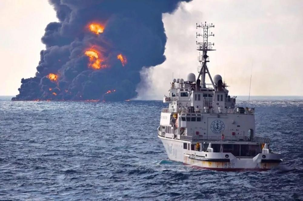 وكانت الناقلة المشتعلة التي تحمل قرابة مليون برميل من المكثفات، وهي خام خفيف جدا سريع الاشتعال، قد غرقت مساء أمس بعد أن أضعفت عدة انفجارات جسم السفينة.