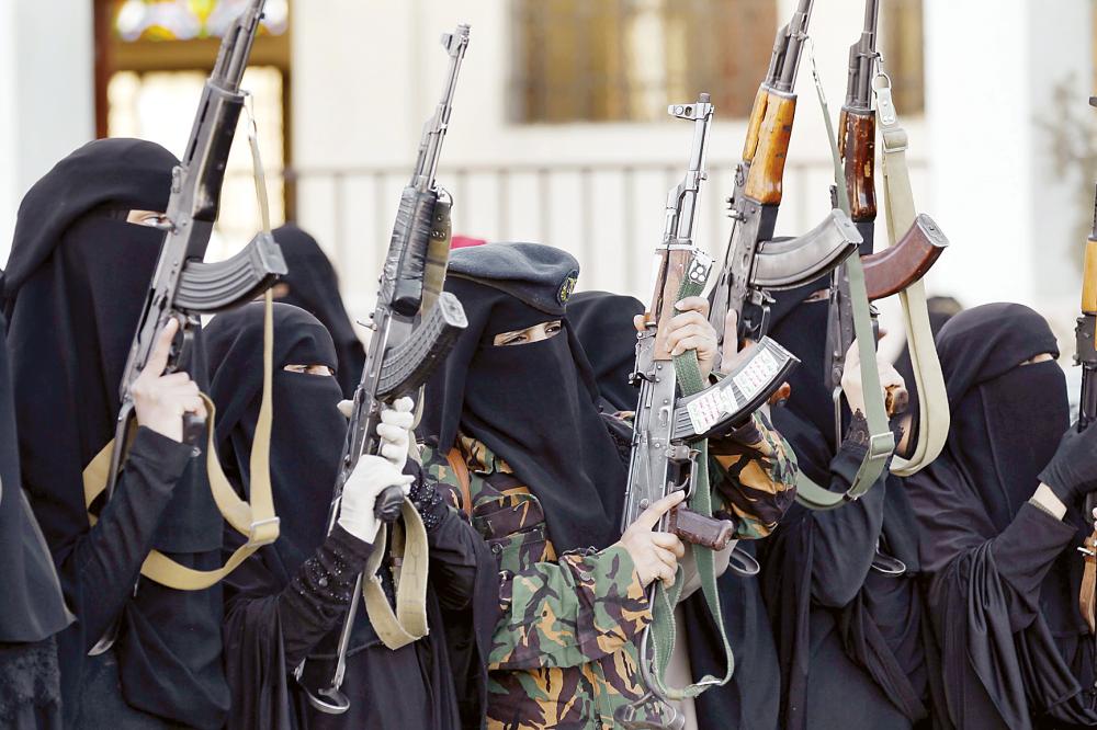 مواليات للحوثي يحملن السلاح في استعراض لدعم الميليشيات المنهارة أمس الأول. (أ.ف.ب)