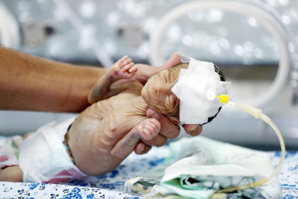 طفل يمني حديث الولادة يعاني من سوء التغذية يتلقى العلاج في أحد مستشفيات صنعاء أمس. (رويترز)