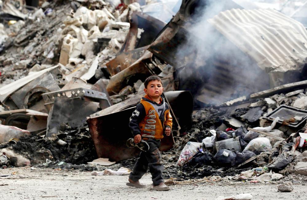 طفل سوري يمشي وسط حطام المباني المدمرة في مدينة الرقة. (أ ف ب)