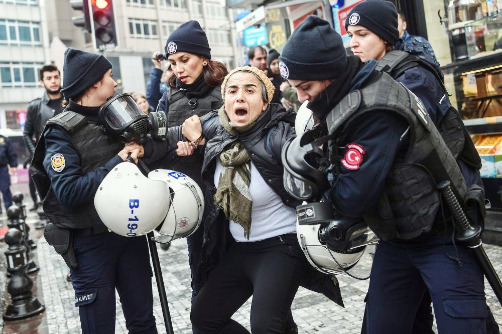 شرطيات تركيات يعتقلن محتجة خلال مظاهرة تندد بالعملية العسكرية في عفرين أمس. (أ.ف.ب)