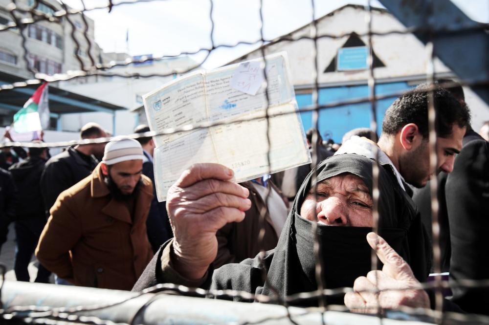 مسنة فلسطينية تلوح بوثيقة صادرة عن «الأونروا» خلال مظاهرة أمام مقر الوكالة في غزة أمس. (أ ف ب)