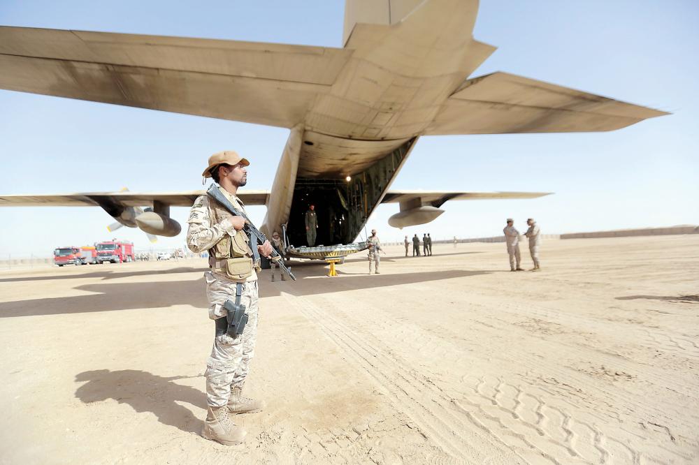 جندي سعودي يؤمن تفريغ المساعدات من طائرة شحن تابعة لسلاح الجو السعودي في مطار مأرب. (أف)