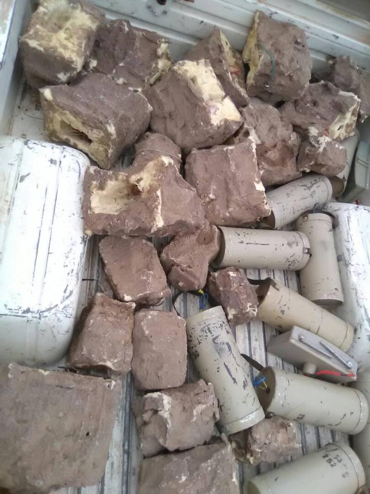 ألغام ومتفجرات عثر عليها الجيش الوطني في مخزن للميليشيات في المخا أمس.(المقاومة التهامية)