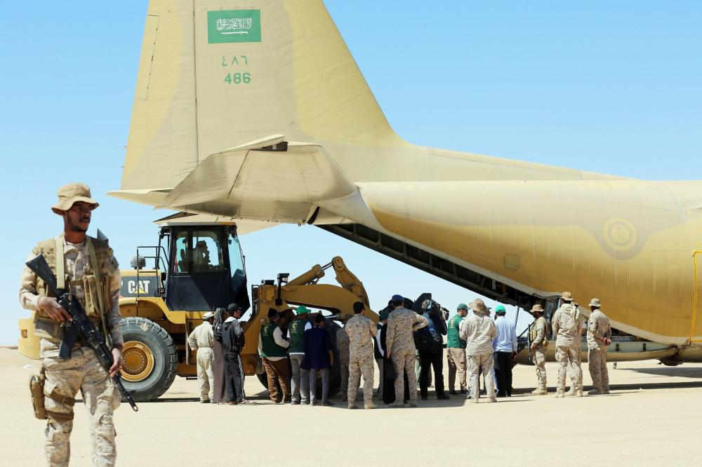 Saudi soldiers stand guard as workers unload aid from a Saudi air force cargo plane at an airfield in Yemen's central province of Marib, on February 8, 2018. / AFP / ABDULLAH AL-QADRY