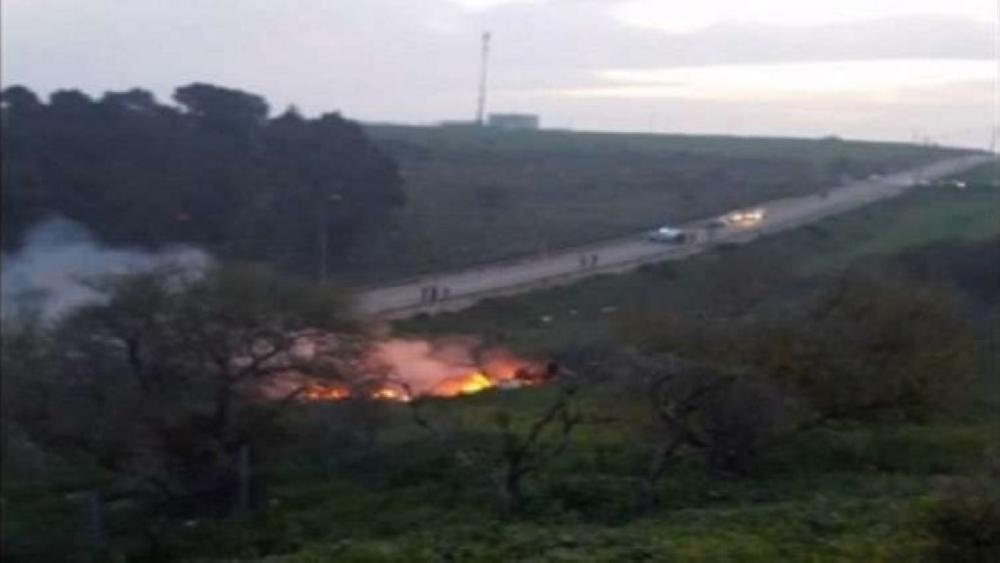 صورة متداولة من مقطع فيديو لموقع تحطم الطائرة الإسرائيلية. (مواقع التواصل الاجتماعي)