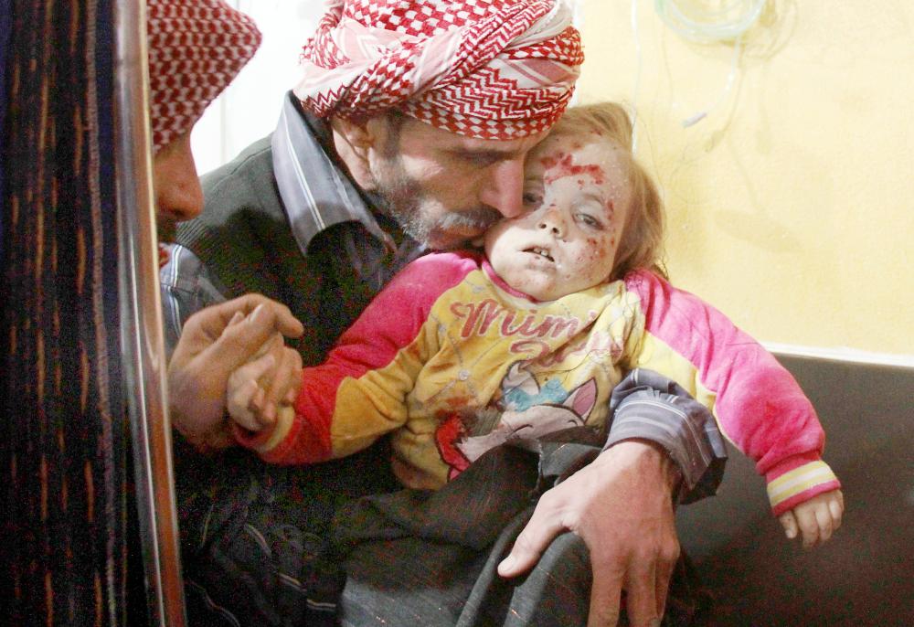 سوري يحتضن جثة ابنته التي قضت في قصف لنظام الأسد على دوما أمس الأول. (أ ف ب)
