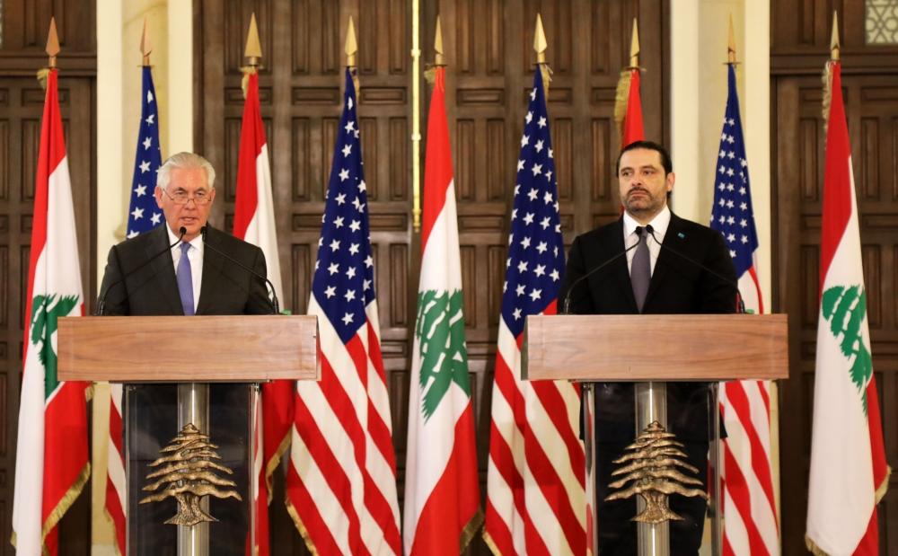 وحث تيلرسون خلال مؤتمر صحفي مشترك عقده مع رئيس الحكومة اللبنانية سعد الحريري في مقر الحكومة قادة لبنان على التمسك بسياسة النأي بالنفس عن الصراعات الإقليمية.