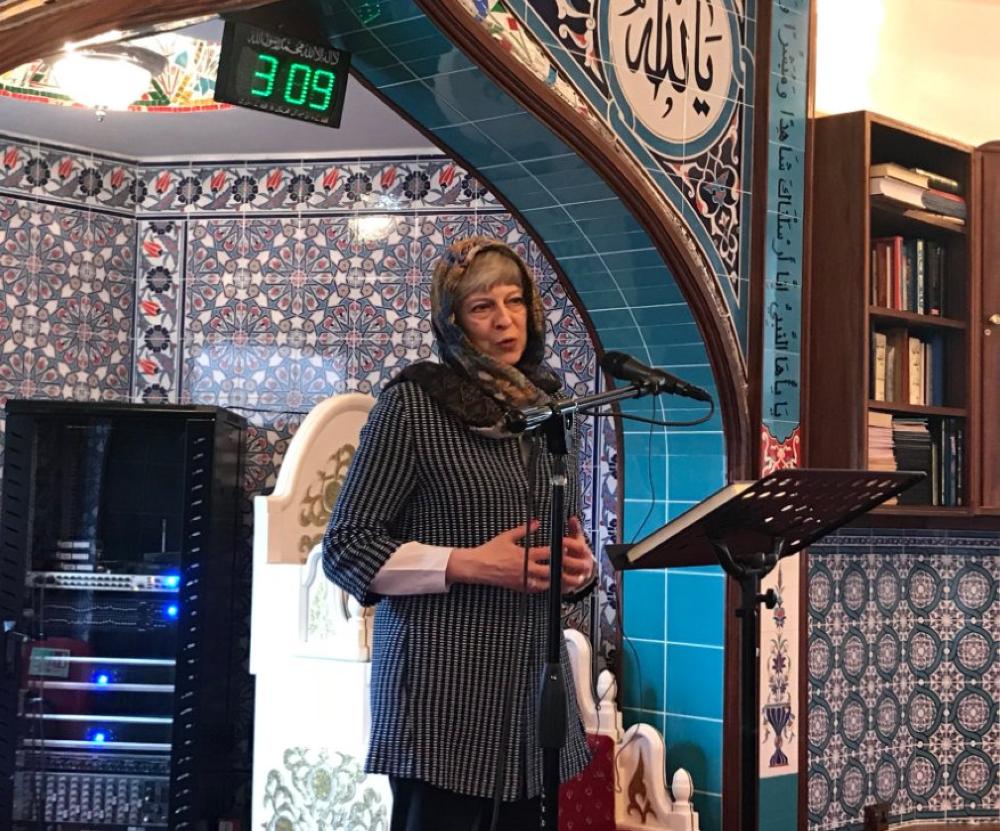 ونشر مجلس مسلمي بريطانيا، منظم الفعالية، على حسابه بموقع "تويتر"، صورا لـ"ماي" وهي ترتدي الحجاب وتلقي كلمة من داخل المسجد.