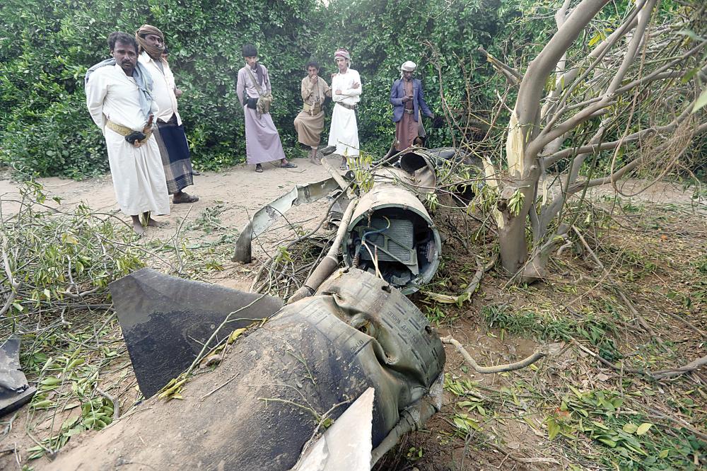 يمنيون يتفقدون بقايا صاروخ باليستي أطلقه الحوثيون على مأرب أمس الأول. (رويترز)